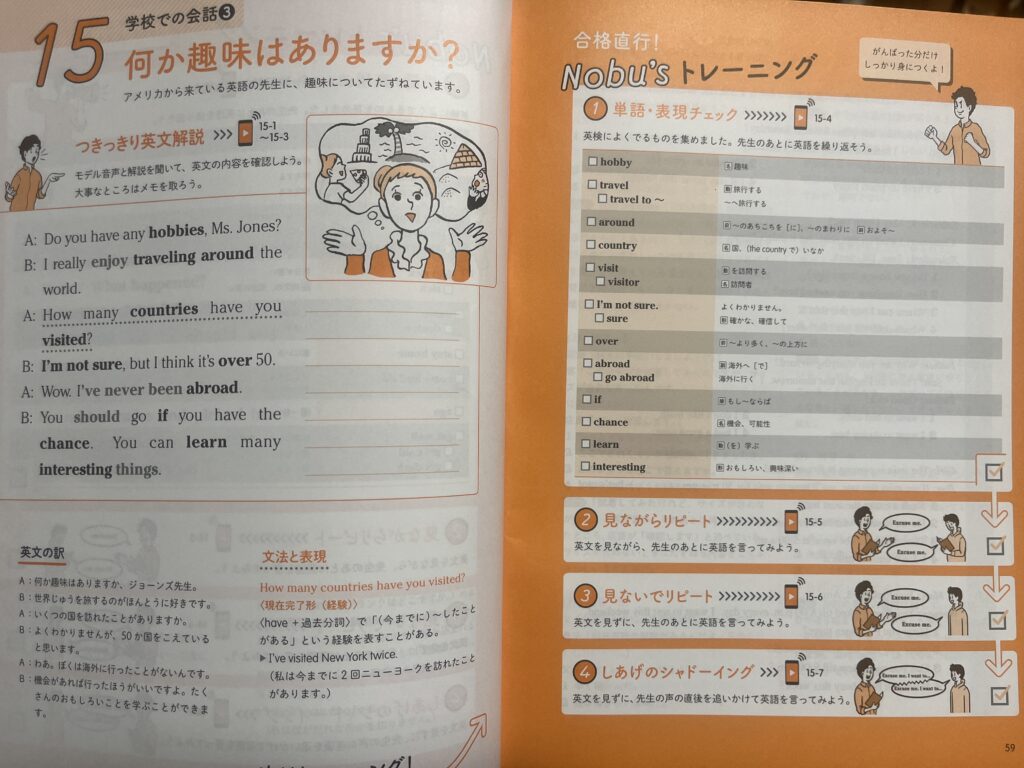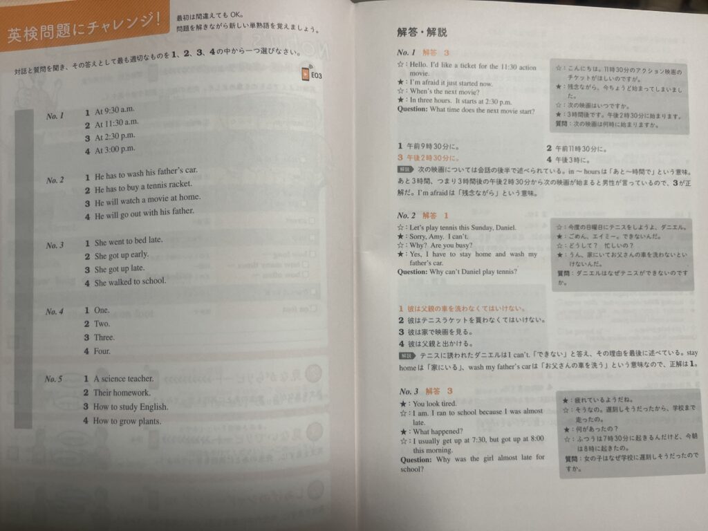 まず、とにかく聞くことと話すことを中心として作られているのは、文法や単語の習得に役立つだけでなく、英検3級でのリスニングや二次面接の対策にもなり、とてもいいと思います。